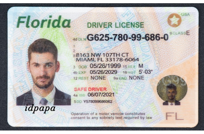 Florida novelty driver license with photo ID, labeled "IDPAPA" for entertainment use.