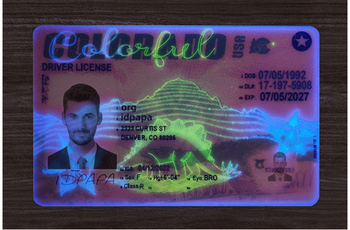 IDpapa Colorado fake ID cards are crafted using 1:1 real ID proportions and features, with attention to state-specific UV images, dynamic light-reactive elements, and real-feel textures. We use Teslin and polycarbonate layers, matching DMV-level durability. Our advanced lamination delivers vibrant, layered effects just like real cards.